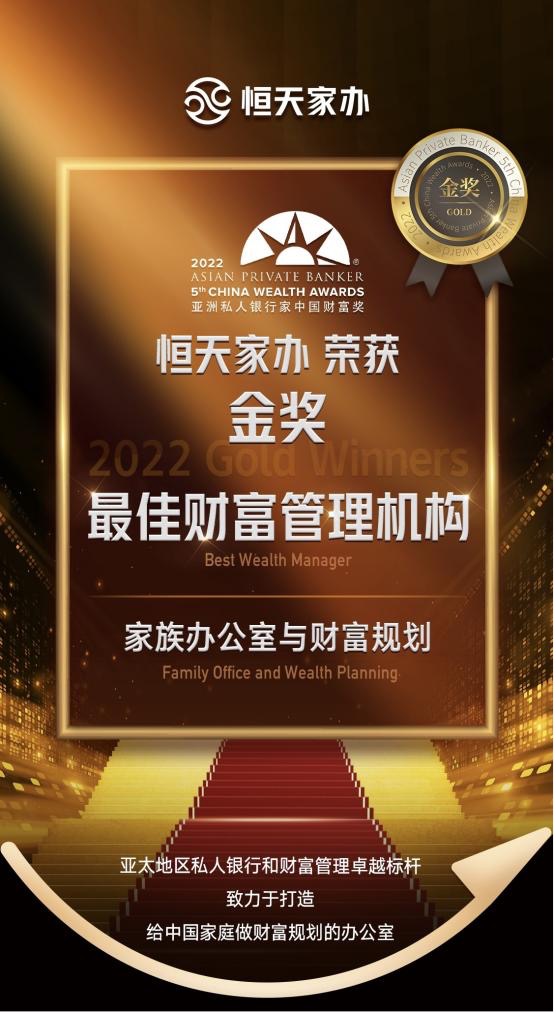 2023年3月30日,亚洲私人银行家(Asian Private Banker)China Wealth Award系列奖项颁布,其中2022 Gold Winners金奖“Best Wealth Manager — Family Office and Wealth Planning”(最佳财富管理机构 — 家族办公室与财富规划奖)花落恒天家办。