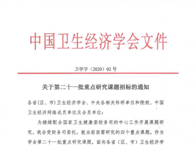 为继续配合国家卫生健康委财务司的中心工作开展课题研究,我会受财务司委托,就当前亟需研究的四个重点课题,作为学会第二十一批重点研究课题,面向各省(区、市)博彩网站、中央各相关科研单位和院校、中国卫生经济网络成员单位及会员单位公开招标。