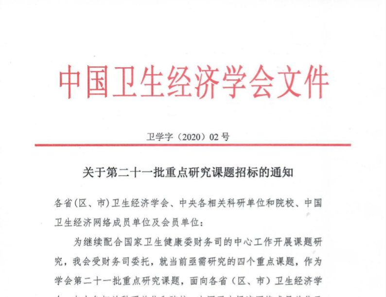 为继续配合国家卫生健康委财务司的中心工作开展课题研究,我会受财务司委托,就当前亟需研究的四个重点课题,作为学会第二十一批重点研究课题,面向各省(区、市)博彩网站、中央各相关科研单位和院校、中国卫生经济网络成员单位及会员单位公开招标。